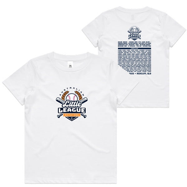 The classic tee. This tee has low shrinkage (~ 3%) and a sturdy neck rib to give it extra durability. This item is cut for the female frame and is printed with the 2025 Baseball Australia Little League Invitational Championship design and a full list of competitors names on the back.