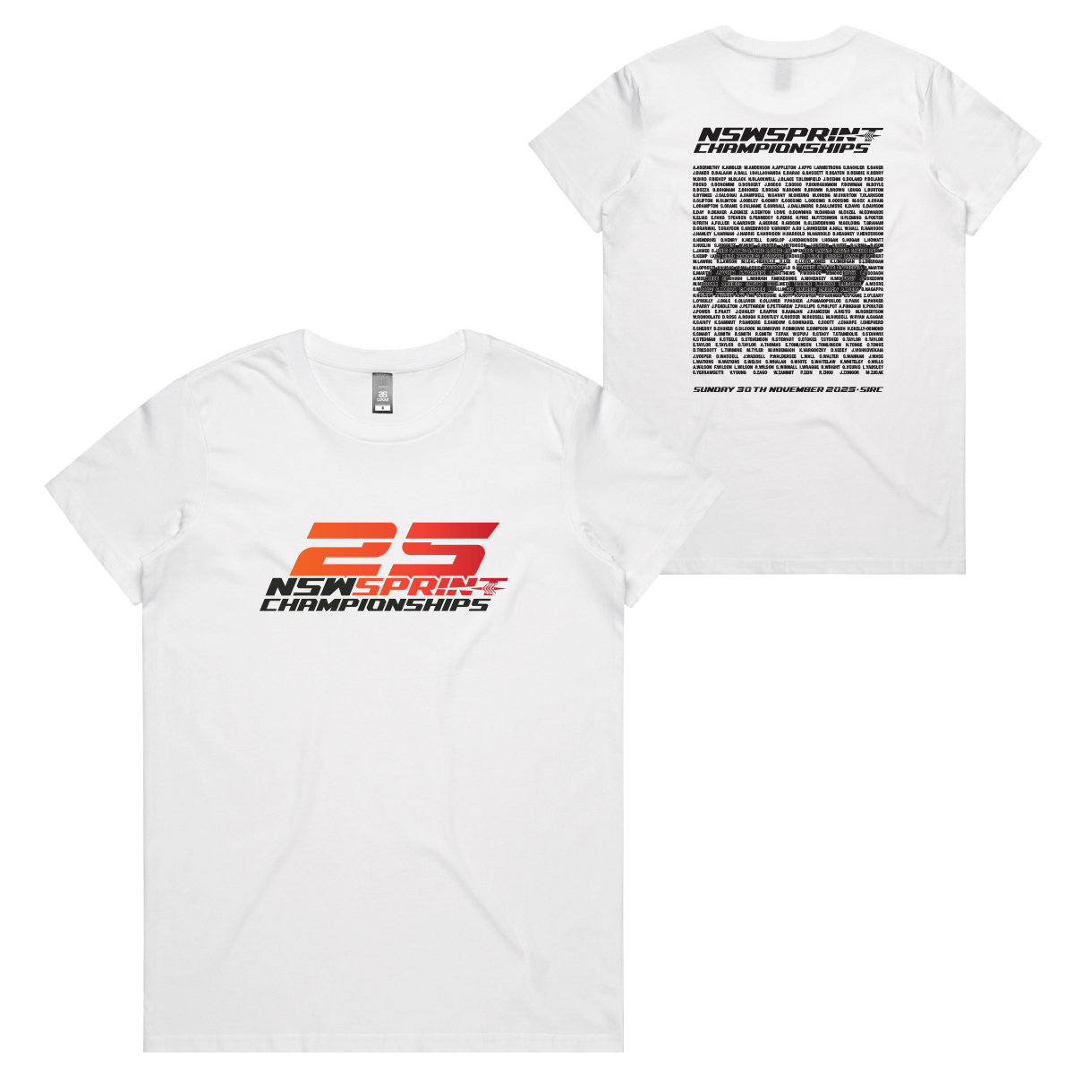 The classic tee. This tee has low shrinkage (~ 3%) and a sturdy neck rib to give it extra durability. This item is cut for the female frame and is printed with the NSW Sprint Championships design on the front and a full list of competitors names on the back.