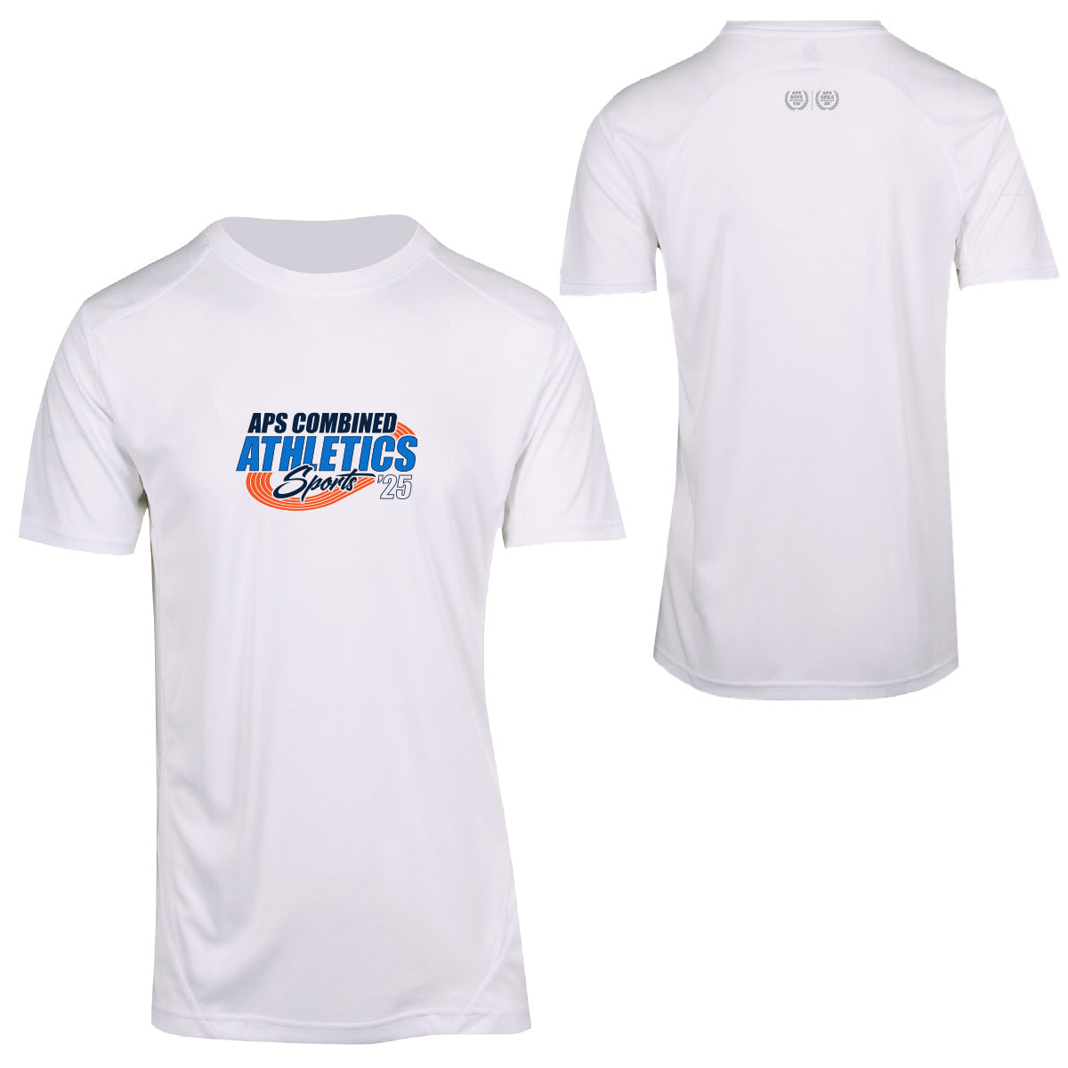 The classic tee. This tee has low shrinkage (~ 3%) and a sturdy neck rib to give it extra durability. This item is cut for the male frame and is printed on the front and back neckline with the APS Combined Athletic Sports Design.