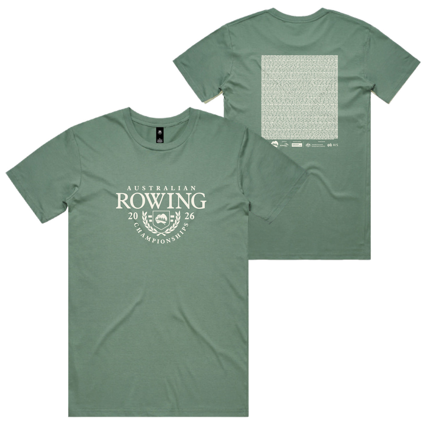 The classic tee. This tee has low shrinkage (~ 3%) and a sturdy neck rib to give it extra durability. This item is cut for the male frame and is printed with the Australian Rowing Championships design on the front and a list of competitors names on the back.