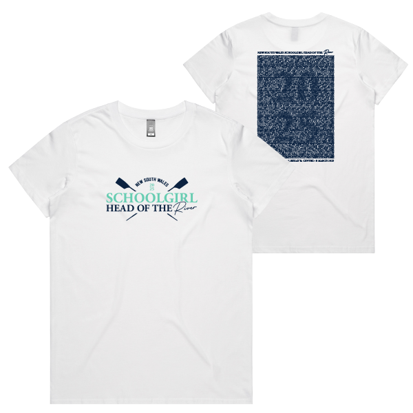 The classic tee. This tee has low shrinkage (~ 3%) and a sturdy neck rib to give it extra durability. This item is cut for the female frame and is printed with the NSW Schoolgirl Head of the River design.