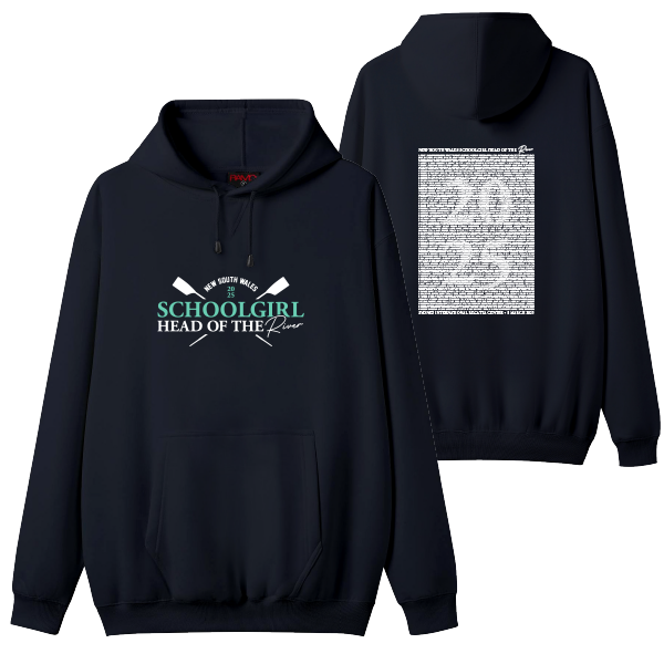 • A garment for almost every occasion. The NSW Schoolgirl Head of the River hoodie is made from a cosy poly cotton fleece with a kangaroo pocket and hood to keep your hands and head warm. This hoodie is printed with the NSW Schoolgirl Head of the River design on the front and a full list of competitors names on the back.