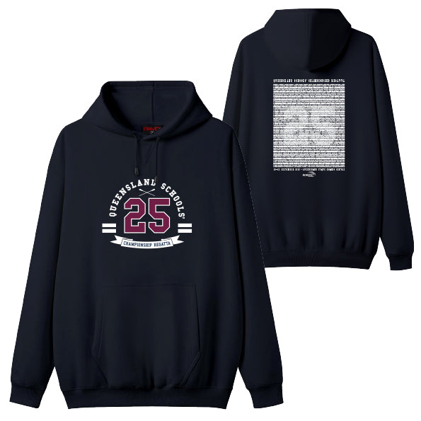 A garment for almost every occasion. The QLD School Championships hoodie is made from a cosy poly cotton fleece with a kangaroo pocket and hood to keep your hands and head warm. This hoodie is printed with the QLD School Championships design on the front and a list of competitors names on the back.