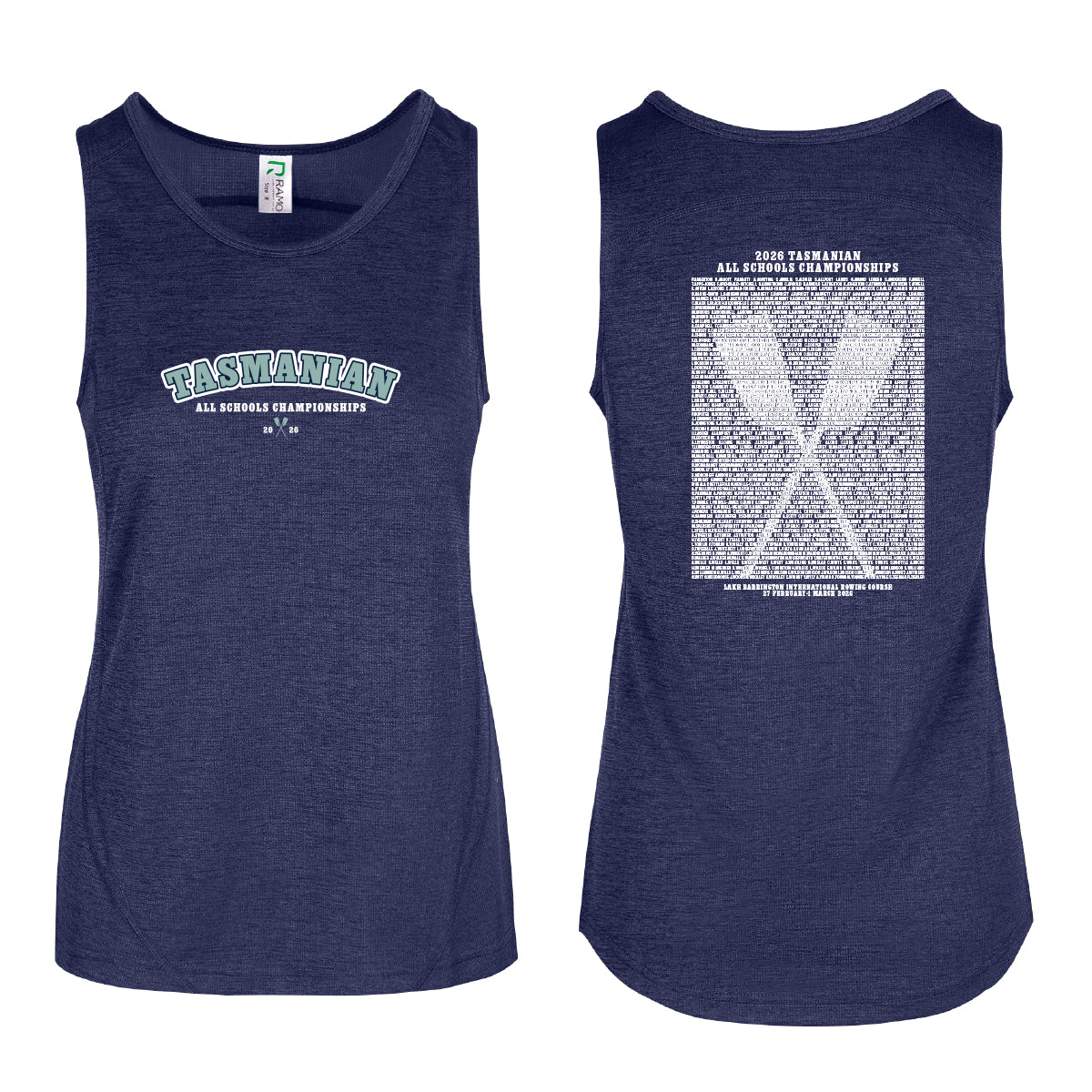 The TAS Schools singlet is perfect for keeping you cool when it's hot out. This top has a female cut and is printed with the Tas Schools design on the front and a list of competitors names on the back.