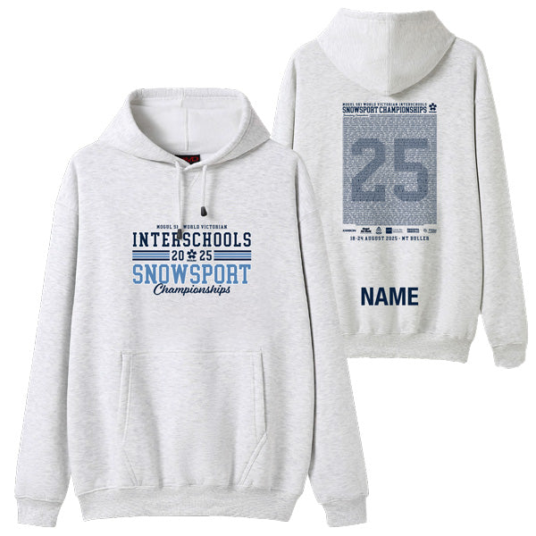 A garment for almost every occasion. The VIC Secondary State ISSC hoodie is made from a cosy poly cotton fleece with a kangaroo pocket and hood to keep your hands and head warm. This hoodie is printed on the front with the VIC Interschools Snowsports design and a full list of SECONDARY competitors names on the back AND YOUR CUSTOM NAME. Please note max character limit is 11.