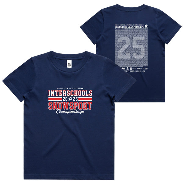 The classic tee. This tee has low shrinkage (~ 3%) and a sturdy neck rib to give it extra durability. This item is cut for kids and is printed on the front with the VIC Interschools Snowsports design and a full list of SECONDARY competitors names on the back.