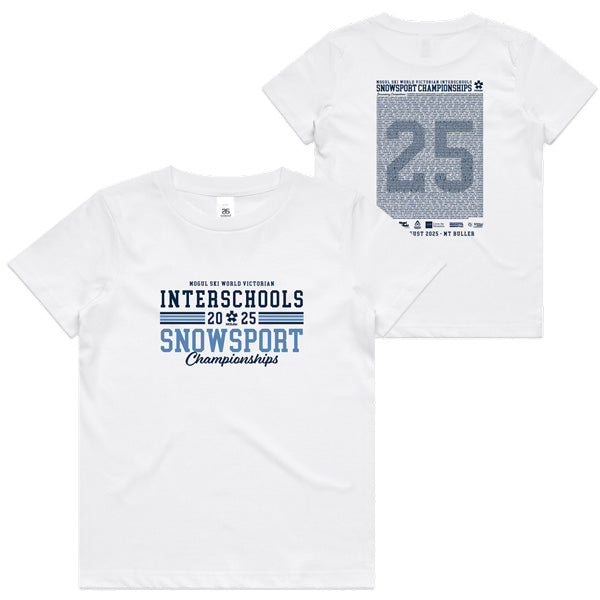 The classic tee. This tee has low shrinkage (~ 3%) and a sturdy neck rib to give it extra durability. This item is cut for kids and is printed on the front with the VIC Interschools Snowsports design and a full list of SECONDARY competitors names on the back.
