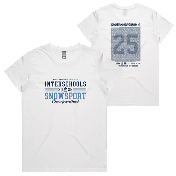 • The classic tee. This tee has low shrinkage (~ 3%) and a sturdy neck rib to give it extra durability. This item is cut for the female frame and is printed on the front with the VIC Interschools Snowsports design and a full list of SECONDARY competitors names on the back.