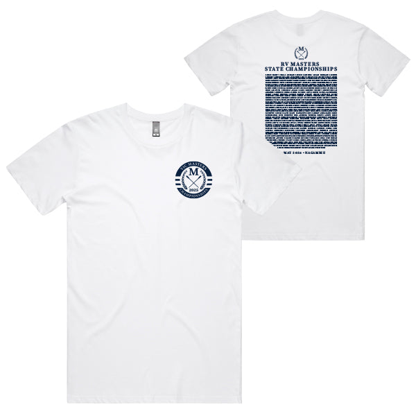 The classic tee. This tee has low shrinkage (~ 3%) and a sturdy neck rib to give it extra durability. This item is cut for the male frame and is printed with the VIC Masters design on the front and a list of competitors names on the back.