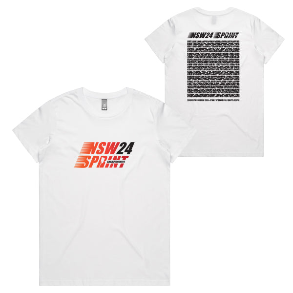 The classic tee. This tee has low shrinkage (~ 3%) and a sturdy neck rib to give it extra durability. This item is cut for the female frame and is printed with the NSW Sprint Championships design on the front and a full list of competitors names on the back.