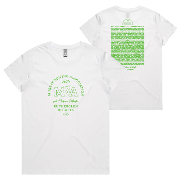 The classic tee. This tee has low shrinkage (~ 3%) and a sturdy neck rib to give it extra durability. This item is cut for the female frame and is printed with the MRA Rutherglen design on the Front and a full list of competitors on the Back.