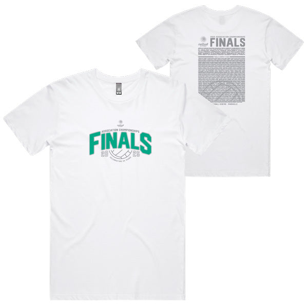• The classic tee. This tee has low shrinkage (~ 3%) and a sturdy neck rib to give it extra durability. This item is cut for the male frame and is printed with the Netball Victoria Association Championships Finals Day design and a full list of competitors on the back