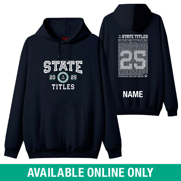 A garment for almost every occasion. This hoodie is made from a cosy poly cotton fleece with a kangaroo pocket and hood to keep your hands and head warm. This hoodie is printed with the Netball Victoria State Titles design on the front, a list of competitors names on the back and a CUSTOM NAME on the bottom