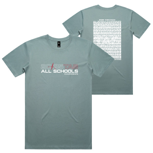 The classic tee. This tee has low shrinkage (~ 3%) and a sturdy neck rib to give it extra durability. This item is cut for the male frame and is printed with the TAS Schools Champs design on the front and a list of competitors on the back.