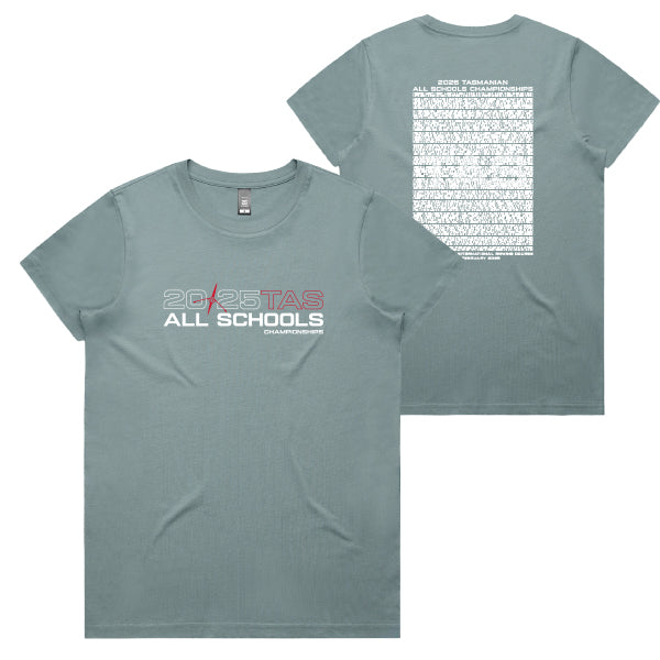 The classic tee. This tee has low shrinkage (~ 3%) and a sturdy neck rib to give it extra durability. This item is cut for the female frame and is printed with the TAS Schools Champs design on the front and a list of competitors names on the back.